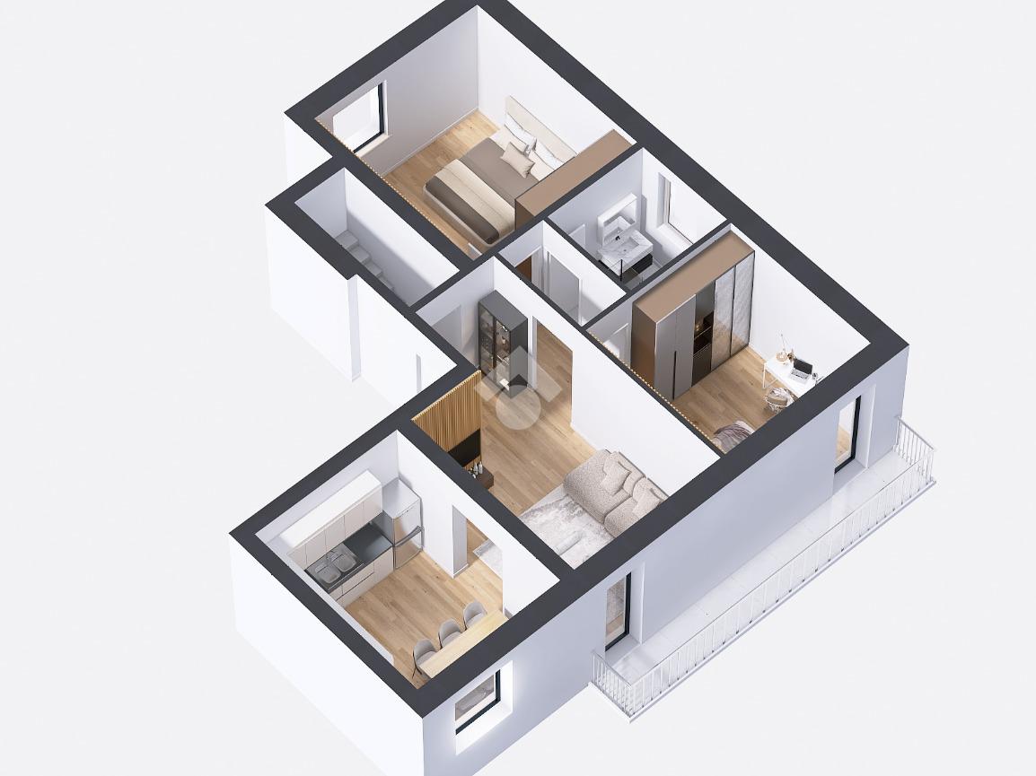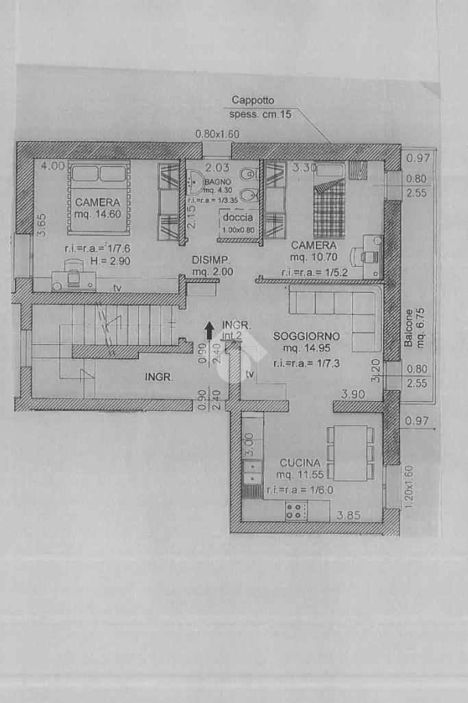 La zona notte comprende due camere da letto, una matrimoniale anch’essa con accesso al balcone della zona giorno e una camera doppia. Bagno finestrato, dotato di box doccia e attacco per la lavatrice.