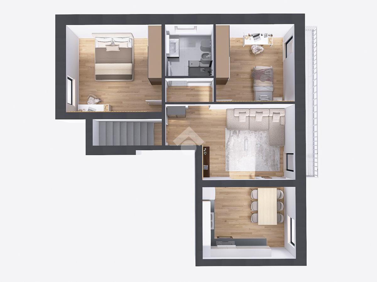 Composta da sole quattro unità abitative, la soluzione è situata al primo piano con ingresso in comune solamente con un altro appartamento.